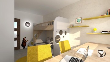 Studenou zeď u postelí jsme zateplily korkovým obkladem ve světlé barvě. Děti mají rádi žlutou barvu, v kombinaci s šedou a dřevem nemůžete udělat chybu