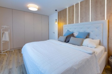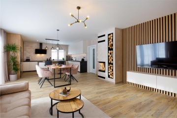 Koncem září jsme se pustili do práce - krb, dekorační stěrka, nábytek na míru do celého domu včetně kuchyně, výběr osvětlení, čalouněný nábytek a nakonec závěsy, záclony a doplňky. První vánoce budou trávit naši klienti již v novém domově.