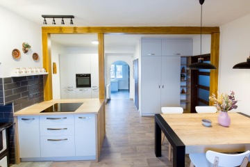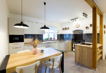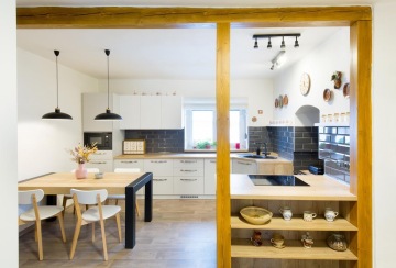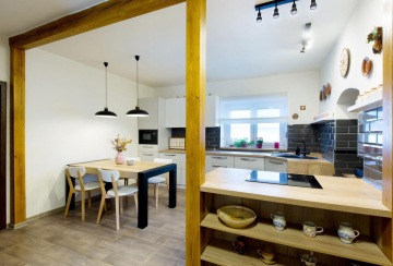 Dřevěné trámy uprostřed kuchyně plní nejen funkci podpěry stropu, ale také dotváří celý interiér staročeské chalupy.